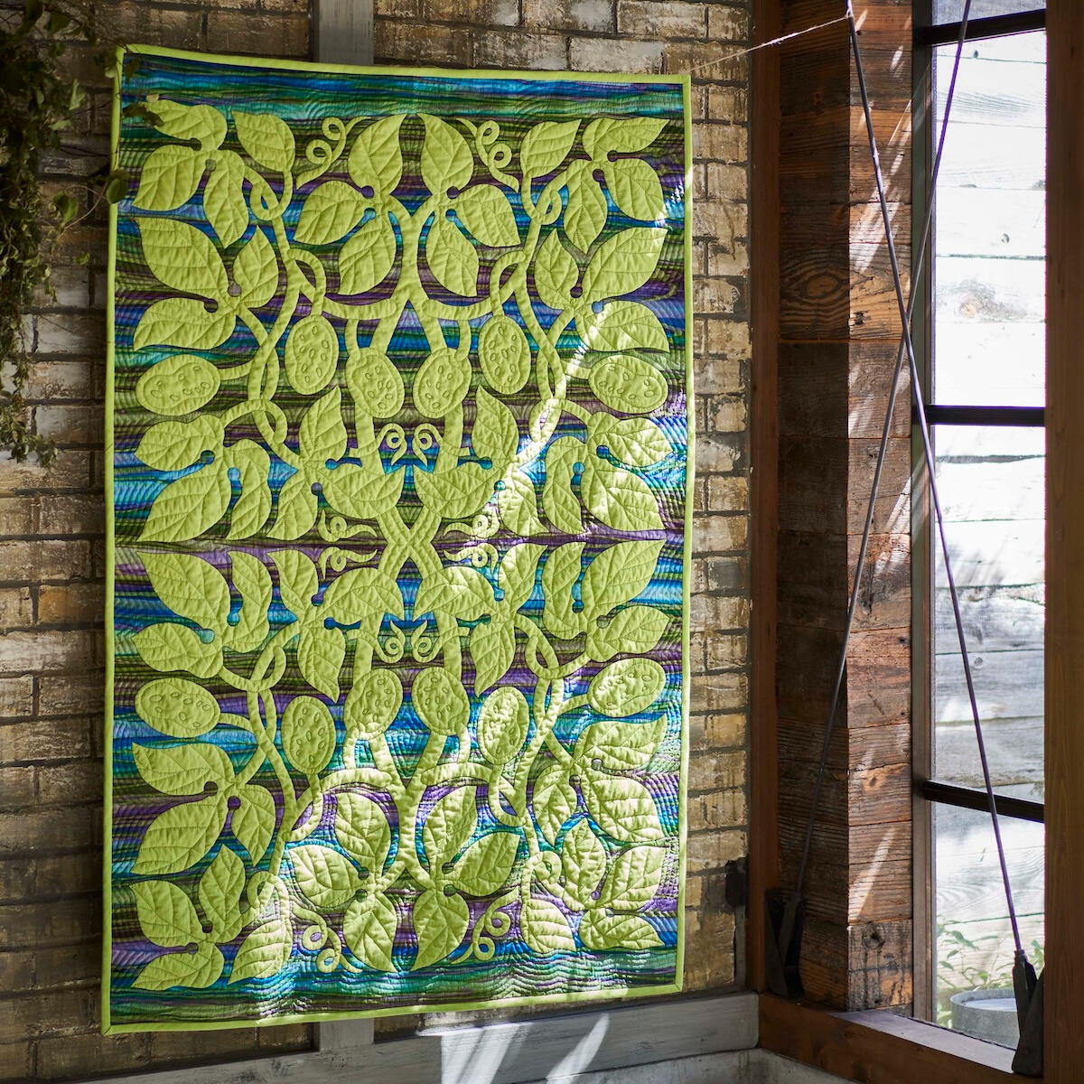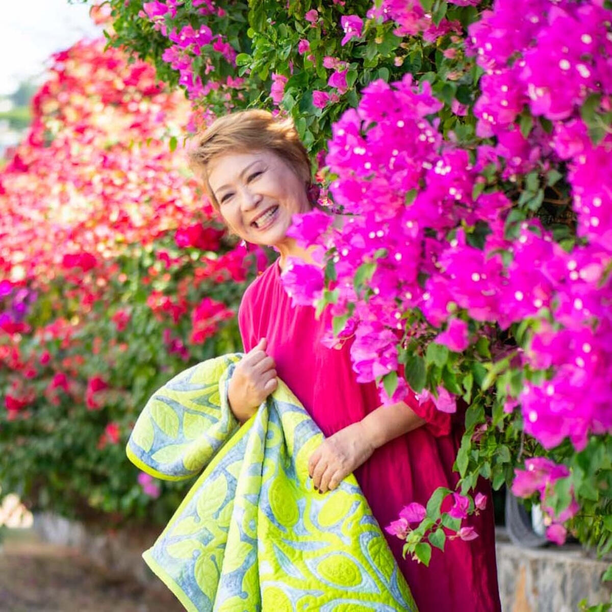 メグさんは多摩美術大学グラフィックデザイン科を卒業後、長年デザイナーとして第一線で活躍されてきました。その卓越した構成力と色彩感覚は、彼女が紡ぎ出すキルト作品の随所に息づいています。彼女の作品の真骨頂は、単にハワイの植物を象るだけではなく、ハワイを吹き抜ける風や光、そしてその場の温度や湿度といった目に見えない「空気感」までもが、布と糸によって繊細かつ大胆に表現されています。近年では、花々が立体的に咲き誇る「3Dランドスケイプキルト」などの革新的な技法にも挑戦しており、キルトを「布の芸術」から、観る者を包み込む「空間のアート」へと昇華させ続けています。
