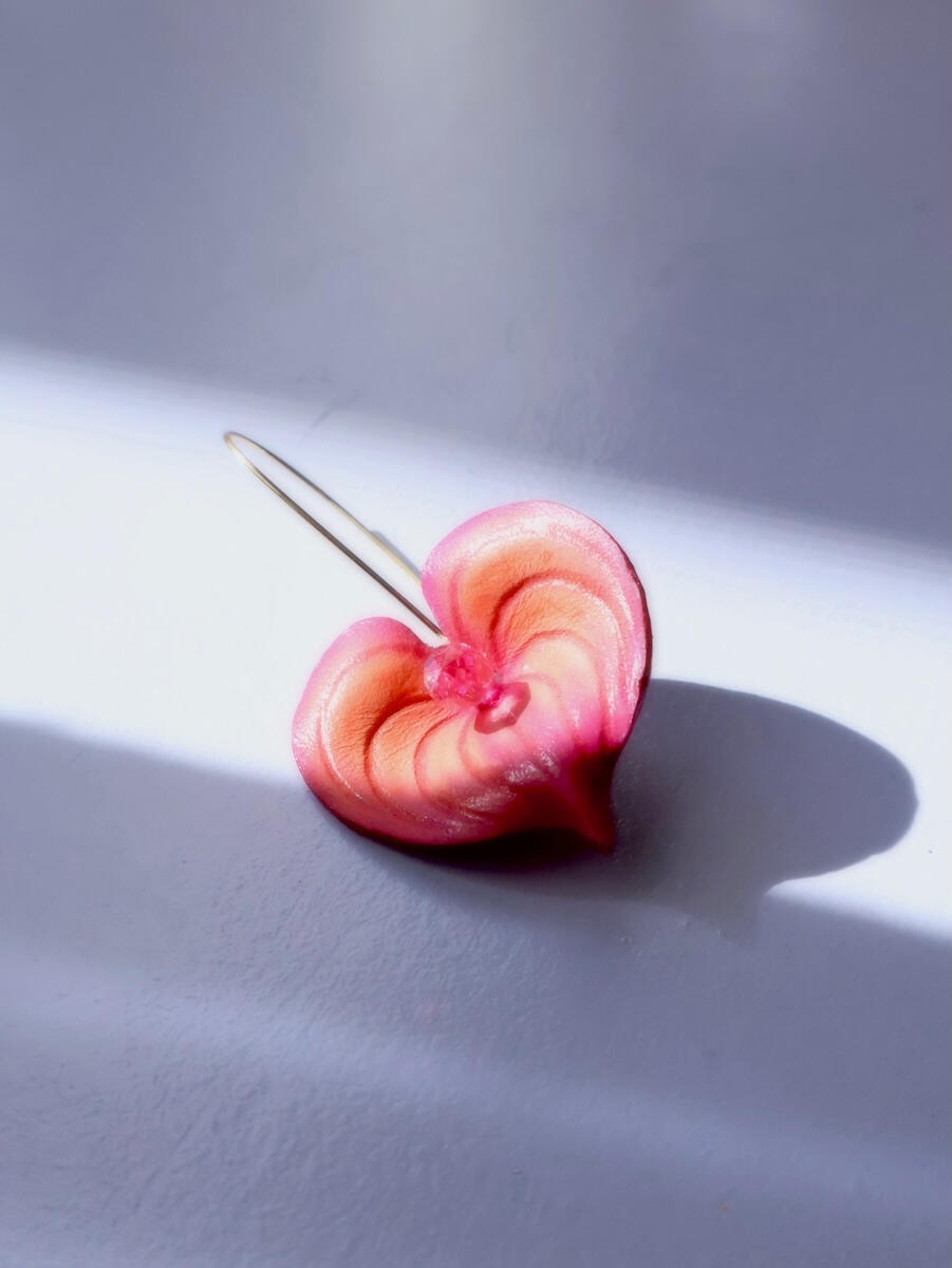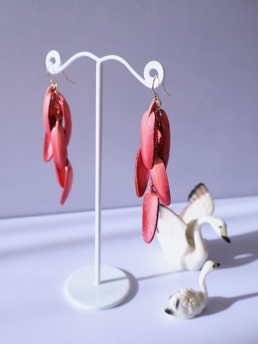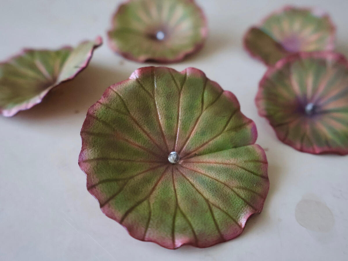 彼女の作品の真骨頂は、革の切り出しから成形、そして鮮やかな染色に至るまでのすべての工程を、自身の「手作業」で行う徹底したこだわりにあります。素材となる革は食肉産業から生まれる大切な資源であるという敬意を持ち、廃棄されてしまうような小さなハギレも無駄にせず、新しい息を吹き込むようにして作品へと昇華させています。