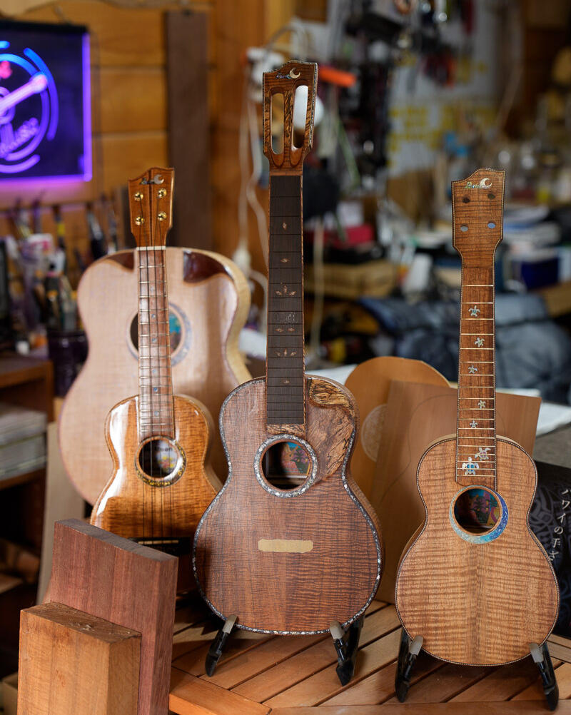 その後、2012年にオーダーメイド専門工房「BLUE MOON CRAFT」を設立。彼の製作スタイルの最大の特徴は、ウクレレビルドをギター製作の緻密な技術をベースに、バイオリンや琴といった多方面の楽器研究から得た要素を融合させている点にあります。