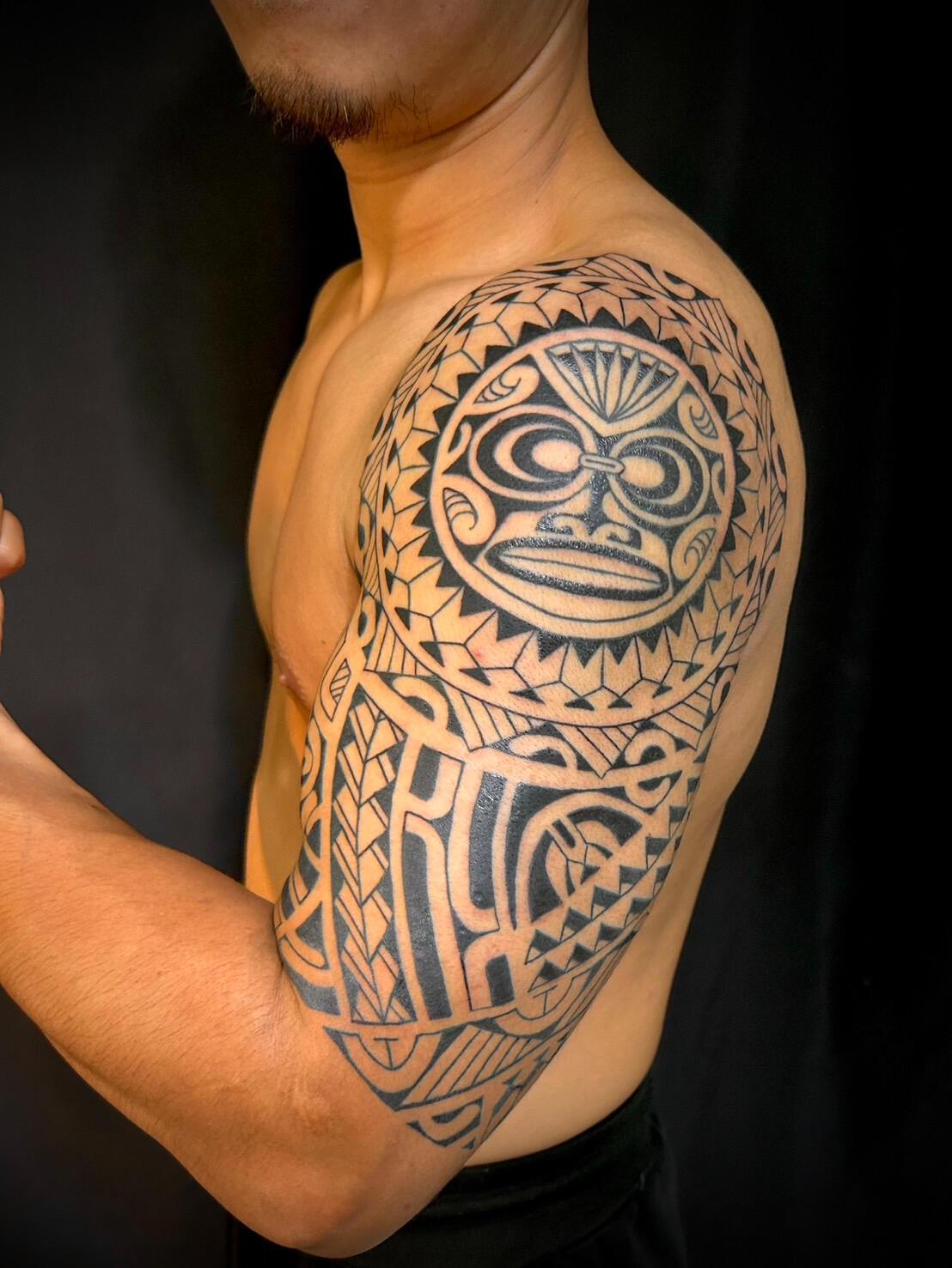 彼女の真骨頂は、数あるスキルの中でも特に困難とされる「フリーハンド」スタイルにあります。彼女は通常タトゥーイストが使用する転写紙を一切使わず、直接人体に下絵専用のペンで複雑な文様を描き込んでいきます。設計士であった父の影響を受け、幼少期から図形を描くことを好んだという彼女のルーツは、複雑な幾何学模様を狂いなく配置する卓越した構成力へと繋がっています。そのライン取りは、単に絵を置くのではなく、一人ひとり異なる身体の曲線や筋肉の動きを計算し、その人を最も美しく見せるように設計されています。その繊細かつ大胆なデザインは、女性ならではの感性が息づく「動く芸術」として高く評価されています。