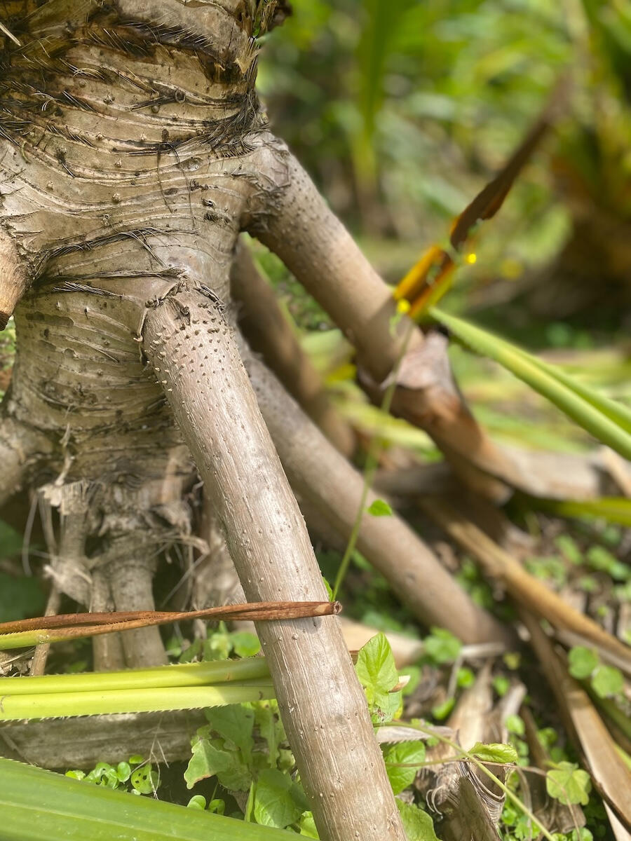 ラウハラの製作は、編む作業の遥か手前、ハラの木をケアすることから始まります。いくつもの工程を経てようやく材料となった葉を、一目、一目、丹念に編み上げていく。その一連の動作は、かつてのハワイアンがどれほど相手を想い、物を大切に扱ってきたかを指先から追体験するプロセスでもあります。一つの編み方が自分の一部となるまで何度も同じ作品を作り続け、一歩ずつステップアップしていく彼女の誠実な姿勢は、作品に凛とした美しさと、手に馴染む温もりを与えています。