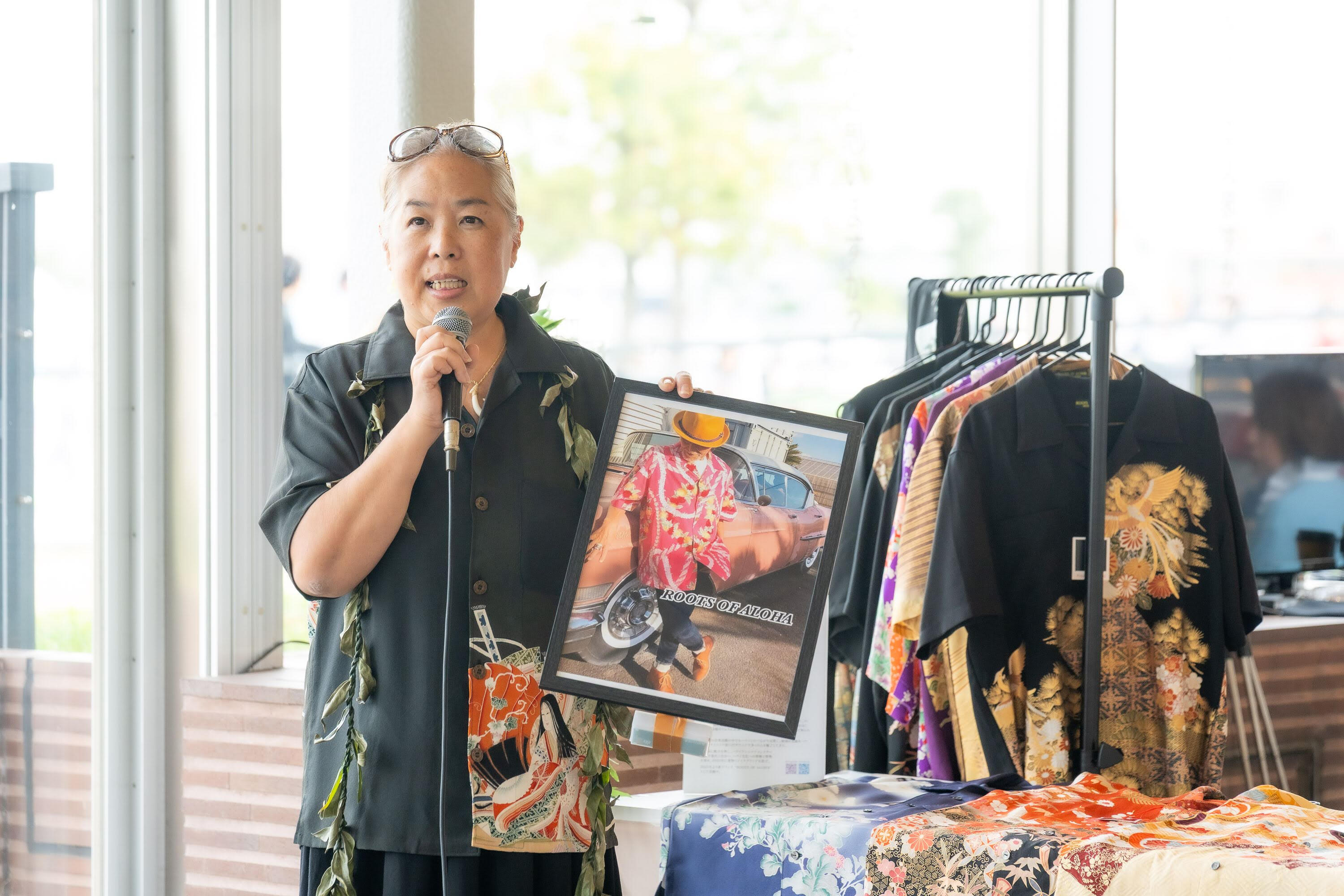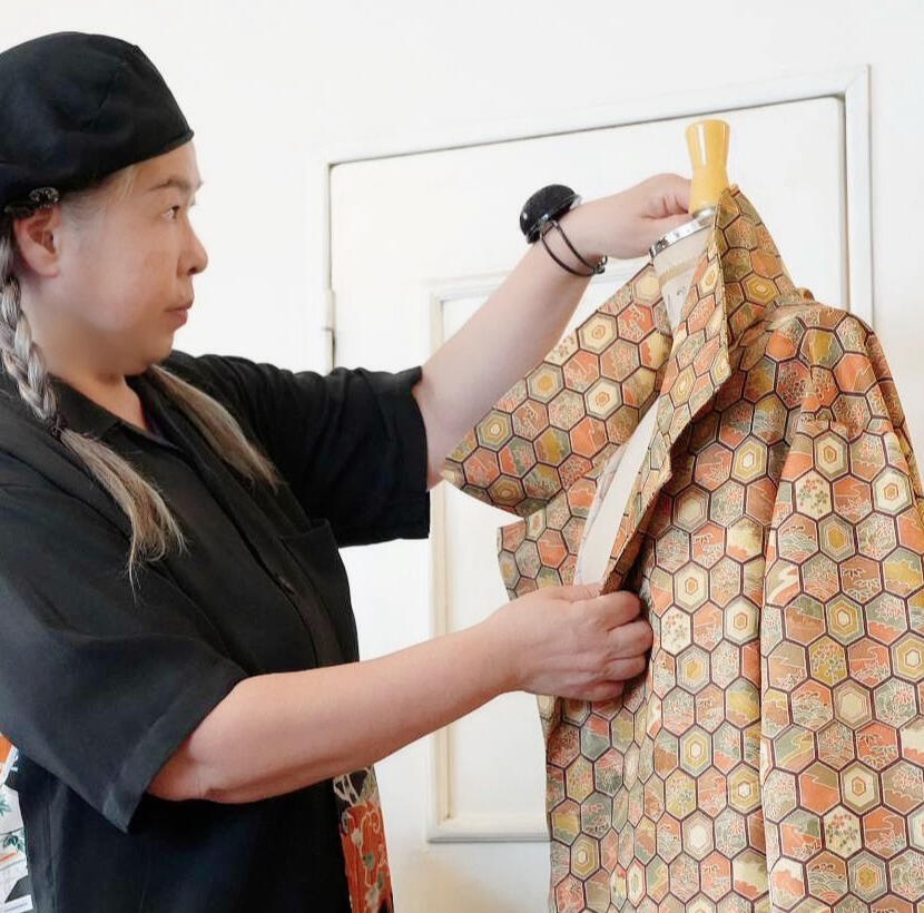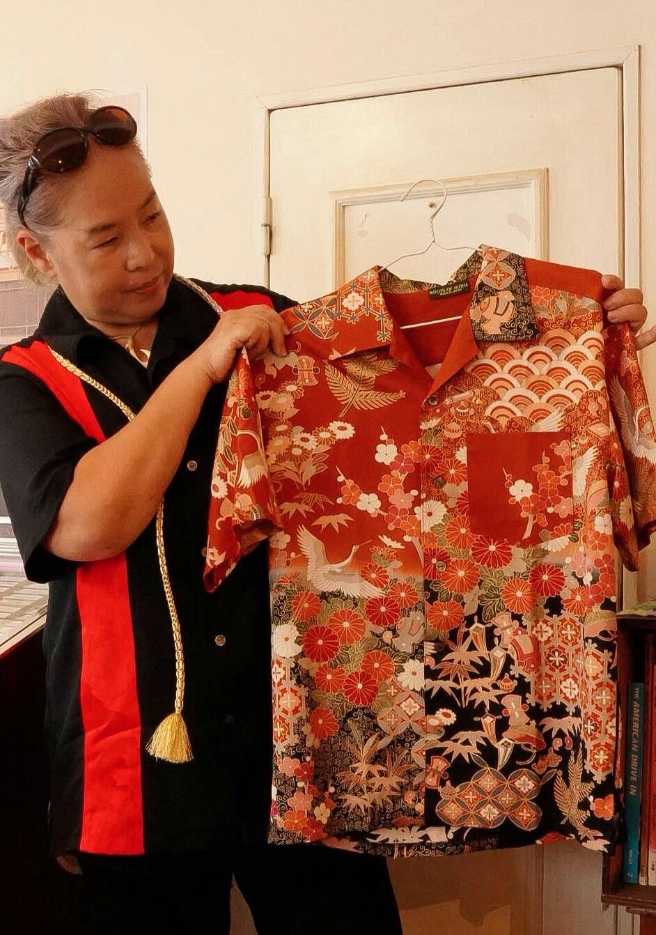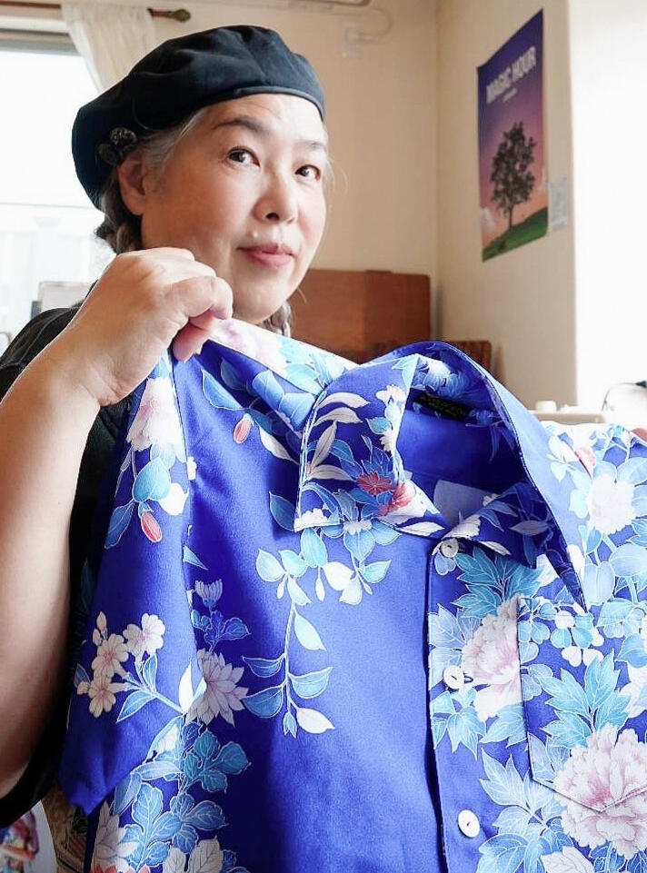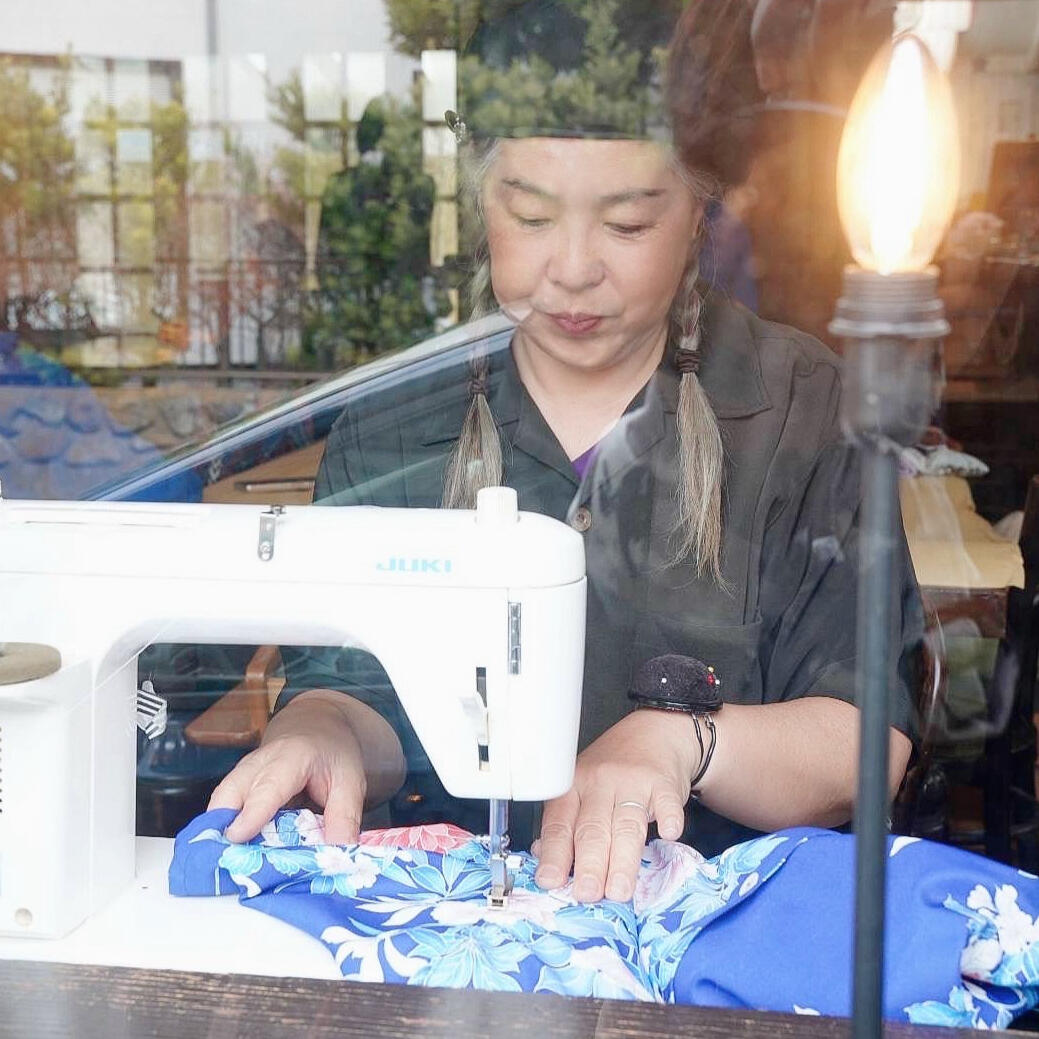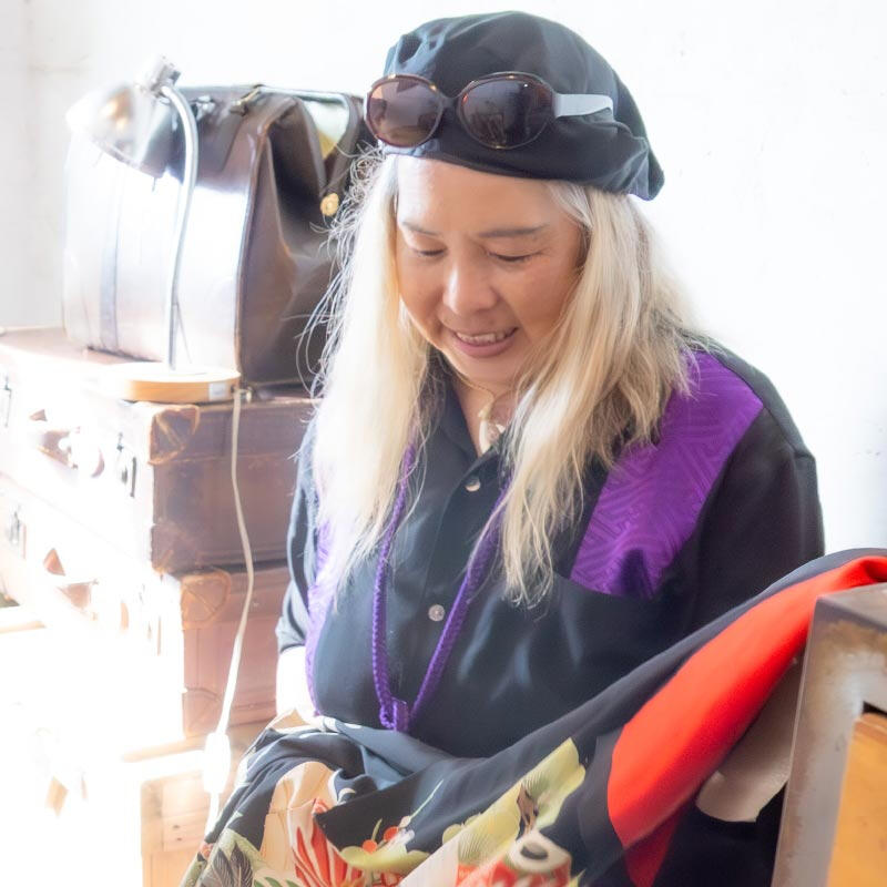 そんな彼女に訪れた大きな転機は、湘南・茅ヶ崎への移住でした。そこでハワイアンシャツコレクターの黒瀬守泰氏と出会ったことをきっかけに、ハワイ文化への理解と情熱をさらに深めていくことになります。音楽を通じて表現してきたハワイアン・スピリットは、やがて「布」という形あるものへと昇華されました。2022年には着物リメイクブランドを設立し、日本の伝統美とハワイの文化を融合させる独自のスタイルを確立しました。
