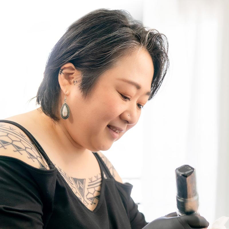 ポリネシア圏の部族柄を専門とする女性彫師 。下絵なしで人体に直接描く「フリーハンド」を得意とし、身体を美しく見せる繊細なライン取りが評価されている 。タトゥーの枠を超えた本格的なポリネシアンアートを追求 。